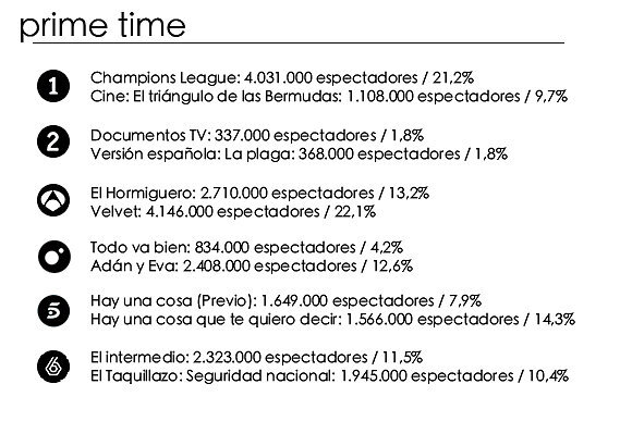 En cuanto al rating, el fútbol de La 1 consiguió un 9,1, Velvet anotó un 9,3, Hay una cosa que te quiero decir un 3,5, Adán y Eva un 5,4 y El taquillazo un 4,4.