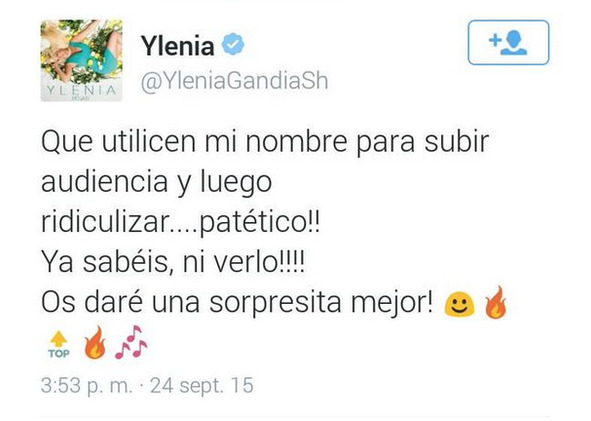 Ylenia no está nada conforme con que Silvia Abril la vaya a imitar este jueves en Tu cara me suena. La exparticipante de Gandía Shore y Gran Hermano VIP ha puesto un tuit que ha borrado a los pocos minutos criticando que se utilice su nombre para subir audiencia.