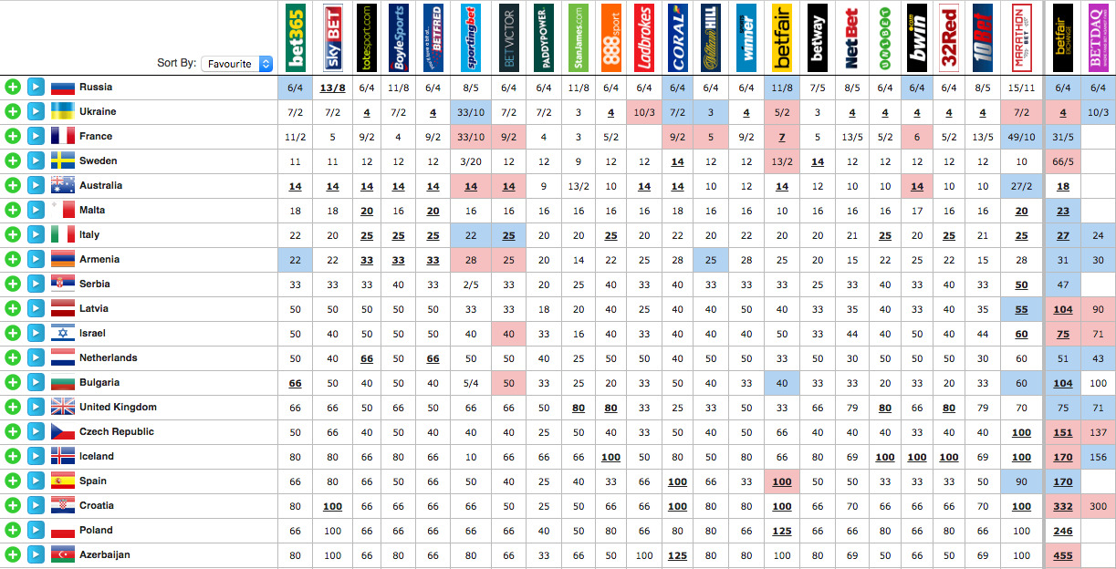Rusia sigue en la primera posición y subiendo después de que todos los países hayan mostrado sus cartas. Parece que la actuación de Francia no ha gustado demasiado y, después de ser una de las grandes favoritas, se ha estancado en la segunda posición con tendencia a la baja. Muy cerca está Ucrania, ya en tercera posición después de haber visto sus intenciones sobre el escenario. Completan el TOP 5 Australia y Suecia, país anfitrión.