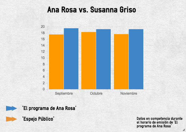 Como conclusión que cierra así el primer trimestre del curso, El programa de Ana Rosa sigue siendo líder manteniendo la corona de la mañana. Con un 19,5%, un 19,2% y un 19,2% en septiembre, octubre y noviembre, el programa sigue en la primera posición sin ningún tipo de duda. El espacio de Telecinco incluso mejora respecto al cómputo de la temporada pasada, que cerró en julio con un 18,8% de cuota. Antena 3 también logra mejorar su resultado en esta franja que cerró la pasada temporada con un 16,6%. Sin embargo, no se puede decir que hay cambio de roles en el liderazgo más madrugador.