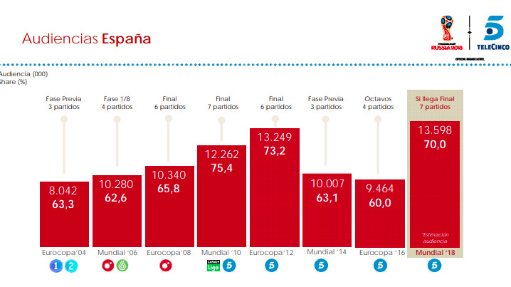 Pero, ¿qué audiencia espera conseguir? Según queda reflejado en su oferta comercial, el grupo de comunicación estima que las audiencias de España si llega a la final (7 partidos) estarán en torno al 70% y 13,6 millones de espectadores de media.