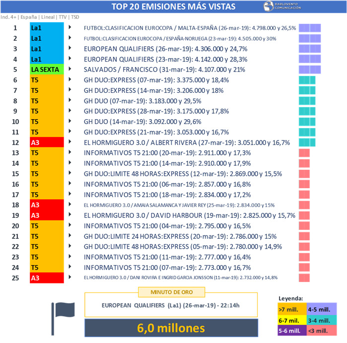 Y es que, según el informe de Barlovento Comunicación sobre los datos de audiencias de marzo, el programa producido por Zeppelin TV logra 9 de las 25 emisiones más vistas del mes.