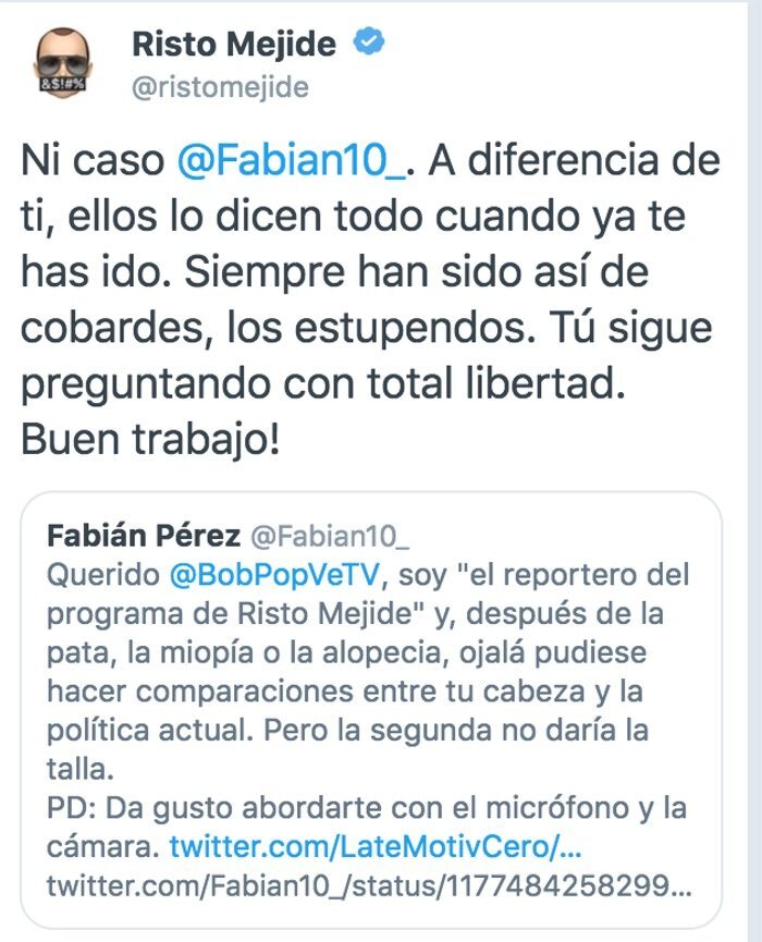 Esto hizo que dicho reportero, Fabián Pérez, respondiera a Bob Pop a través de Twitter. "Querido Bob, soy el reportero del programa de Risto Mejide y, después de la pata, la miopía o la alopecia, ojalá pudiese hacer comparaciones entre tu cabeza y la política actual. Pero la segunda no daría la talla".