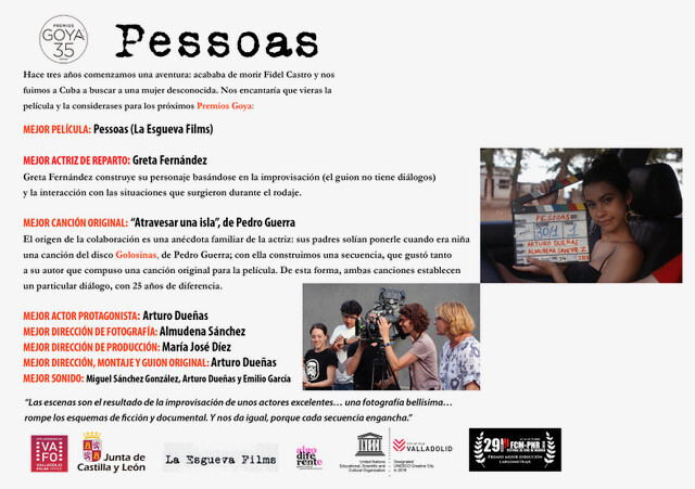 La película recibió el premio a la Mejor Dirección de Largometraje en el último Festival de Cine de Madrid, celebrado el pasado mes de octubre. Además, presenta doce candidaturas a los próximos Premios Goya, entre las que destacan la de Greta Fernández como mejor actriz de reparto, la de Pedro Guerra como compositor de la mejor canción original:Atravesar una isla, Almudena Sánchez como mejor dirección de fotografía, Miguel Sánchez González como mejor sonido y Arturo Dueñas en los apartados de mejor actor principal, dirección, montaje y guion original.El 11 de enero de 2021 se dará lectura de las nominaciones definitivas de los premios Goya y será el momento de saber a cuántos premios opta finalmente Pessoas.