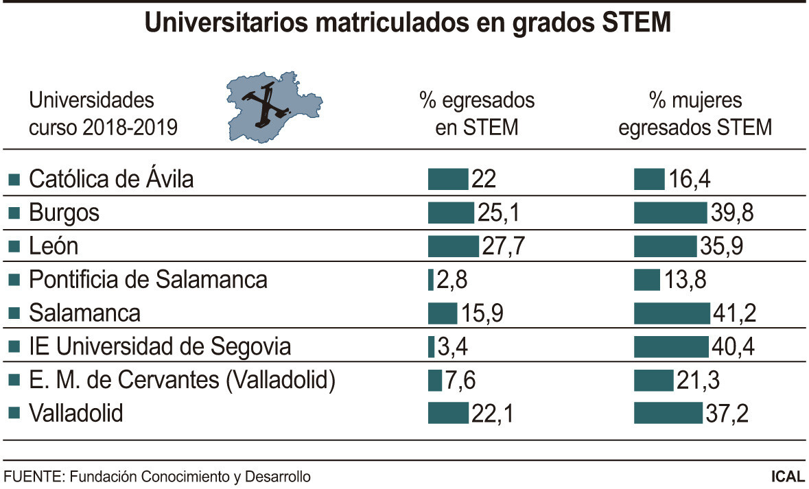Castilla y León registra el tercer menor porcentaje de España de titulados en grados STEM (Ciencia, Tecnología, Ingeniería y Matemáticas), aunque el dato positivo es que la proporción de las mujeres entre los egresados de este tipo de carreras es la tercera más elevada del país. Los perfiles STEM son los más demandados actualmente por las empresas y los expertos auguran que las competencias digitales y otros conocimientos vinculados a los estudios de Ciencia, Ingeniería y Matemáticas serán los empleos del futuro.