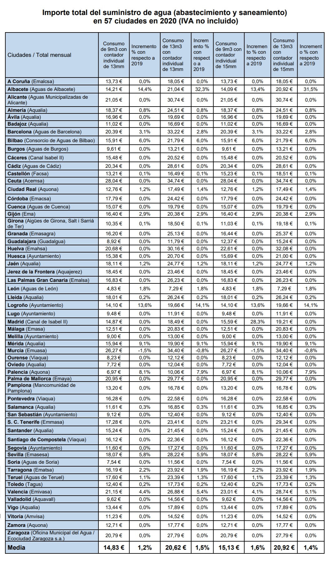 La tarifa del agua varía hasta un 480% según la ciudad en la que se reside, de acuerdo a un estudio realizado por FACUA-Consumidores en Acción sobre las tarifas para el año 2020 del suministro domiciliario de agua en 57 ciudades españolas. Ceuta es la ciudad española con el agua más cara, seguida, para un consumo de 9 metros cúbicos, de Murcia. Después, las ciudades más caras difieren en función del diámetro del contador. Para contadores de 13 mm, siguen a Ceuta y Murcia Valencia, Alicante y Palma. En el caso de los contadores de 15 mm, la tercera posición la ocupa Santa Cruz de Tenerife (aunque no tiene ningún contador de este tipo instalado), seguida de Valencia, Huelva y Alicante.