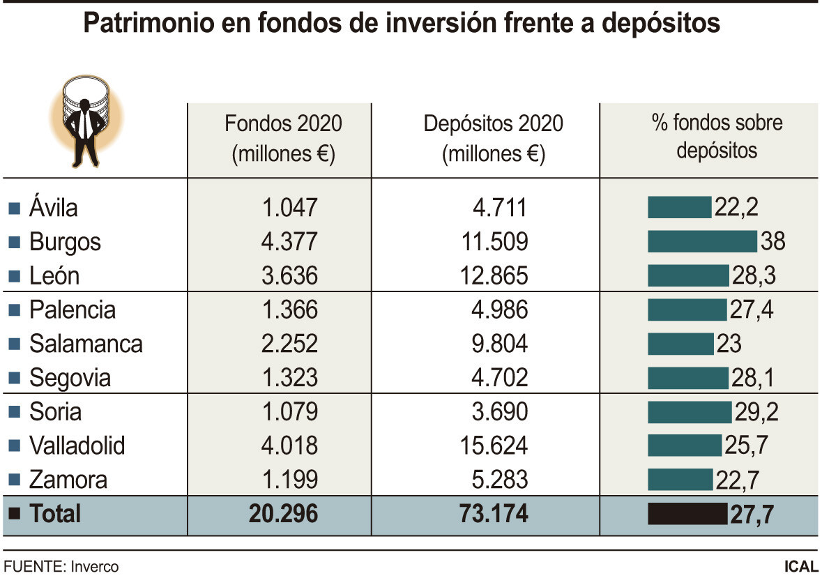 El ratio de fondos de inversión sobre depósitos se sitúa en el 38 por ciento en Burgos; 29,2 por ciento en Soria; 28,3 por ciento en León; 28,1 por ciento en Segovia; 27,4 por ciento en Palencia; 25,7 por ciento en Valladolid; 23 por ciento en Salamanca; 22,7 por ciento en Zamora; y 22,2 por ciento en Ávila.