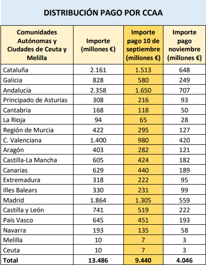La entrega que se efectúa este viernes asciende a los 9.440 millones de euros. El resto del fondo, el equivalente al 30% del total, es decir, los 4.046 millones de euros, se distribuirá el próximo mes de noviembre, según lo acordado.