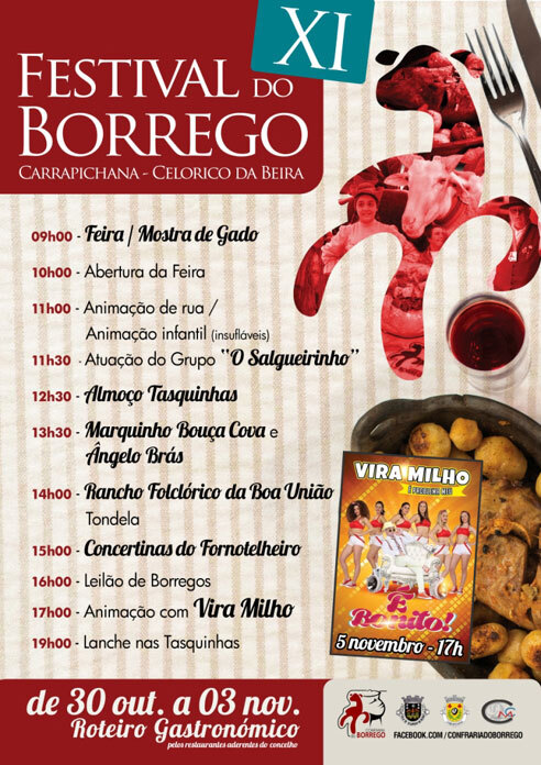 Este programa incluye una feria muestra de ganado, subasta de corderos, folclore y variada animación popular, entre otras varias actividades. Entre ellas, cabe destacar la actuación del artista de música popular portuguesa 'Vira Milho', el día 5 de noviembre, así como la presencia de tascas donde los visitantes pueden deleitarse con las recetas tradicionales, con especial enfoque para los platos y aperitivos confeccionados y que tendrán por base al cordero de la Serra da Estrela. Todo en la freguesía de Carrapichana, y que organiza la Confraria do Borrego e Câmara Municipal de Celorico da Beira.