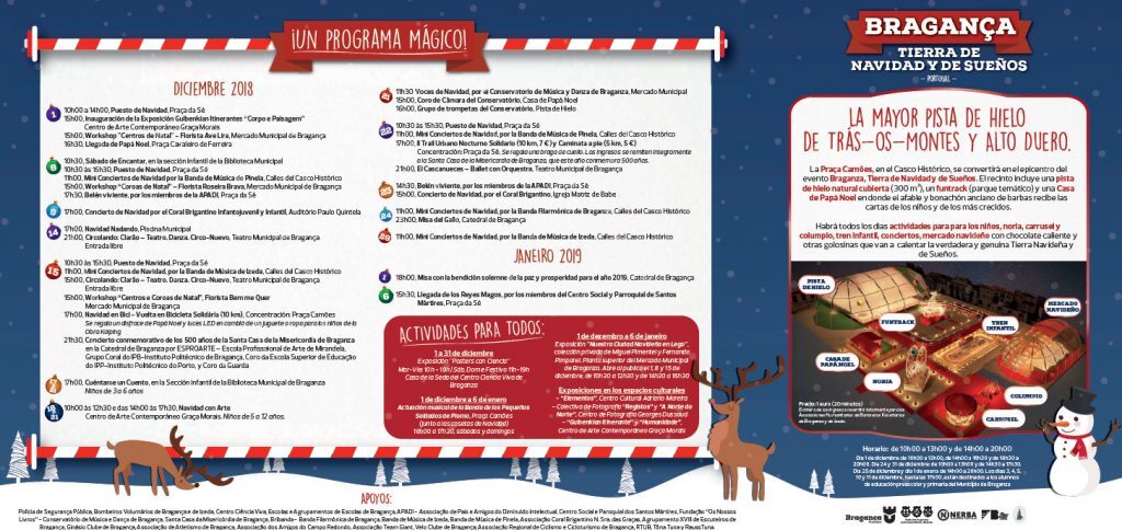 Papá Noel llegó de Laponia con esquimales, ángeles, duendes, ice girls, muñecos de nieve y tres bandas filarmónicas para hacer las delicias de los más pequeños, a quienes se les regalaba un gorro de Navidad para fundir la plaza Cavaleiro de Ferreira en una algarabía verde y blanca -el verde de la Sierra de Montesinhos y el blanco de la nieve que comenzaba a caer en las cimas lamidas por la niebla-. Una fiesta que continuó con el desfile por las calles del centro de Bragança hasta la Plaza Camões, en el Centro Histórico de la ciudad, donde un Belén a tamaño natural recibe a los visitantes, para acompañar a Papá Noel hasta su casita encantada.
