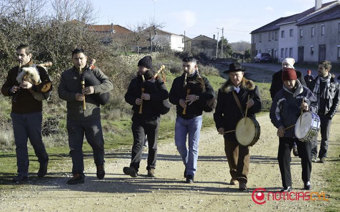 Por la mañana, el Carocho y la Vieja, acompañados por los Pauliteiros, al son de los gaiteros, recorren todas las calles de la aldea, para invitar a los habitantes a la fiesta y recogen los guinaldos/esmola, en dinero o especie (como embutidos incluso con el rito del robo, si fuera preciso, por el mascarado). Al final de la mañana, el cansancio no consigue detenerlos y se dirigen hasta la iglesia donde se celebra la misa, en la que los pauliteiros danzarán el ‘Acto de Contrição’ al son de la flauta pastoril y el tamboril, con la gaita de foles sonando cuando se levanta la Hostia. Y después de la procesión, los pauliteiros danzan en el sagrado, con el Carocho y la Vieja presentes.