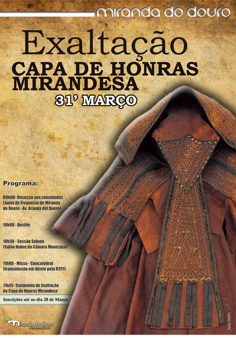 La Câmara Municipal de Miranda do Douro programa para este domingo, 31 de marzo, la IV edición de la Exaltación de la Capa de Honras Mirandesa, una pieza única del vestuario tradicional portugués y, todavía, en uso en el concejo mirandés. Este evento busca valorizar la capa de honras así como registrar el número de capaas existentes y su antiguedad. A este respecto, la Câmara de Miranda do Douro desea reunir el mayor número posible de Capas de Honras, a partir de las 9 horas, en la Junta de Freguesía.