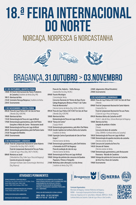 La 18ª Feria Internacional del Norte – Norcaça, Norpesca y Norcastanha está promovida por el Municipio de Bragança, NERBA -Associação Empresarial do Distrito de Bragança, Instituto Politécnico de Bragança, União das Freguesias de Sé, Santa Maria e Meixedo, BRIPESCA, Federação das Associações de Caçadores da 1ª. Região Cinegética (FACIRC), Confraria Ibérica da Castanha, Clube de Caça e Pesca de Bragança e Júlio de Carvalho.