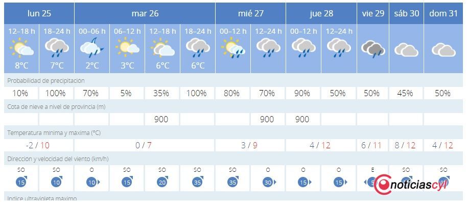 Para el jueves, viernes, sábado y domingo, la AEMET también da previsión de lluvias mientras que las temperaturas seguirán subiendo siendo el domingo, día de Nochevieja, las máximas de 12 grados y las mínimas de solo 4.
