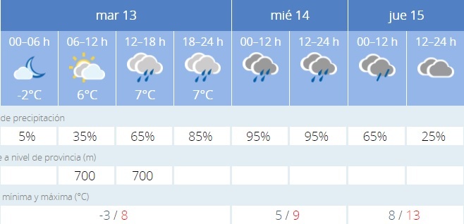 La probabilidad de lluvia para este martes 13 de febrero es del 35% entre las 6 y las 12 y del 65% entre las 12-18, viéndose incrementada esta probabilidad entre las 18 y las 24. Además el frío hará también acto de presencia con los -3 grados de mínima y los 8 de máxima.
