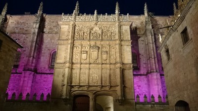 Iluminación especial de la fachada de la Universidad de Salamanca por el Día Internacional de la Mujer / Foto: Usal
