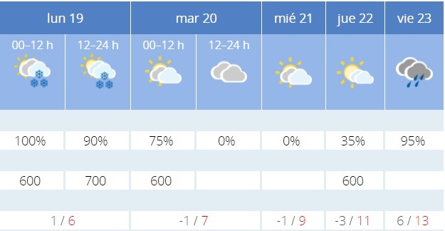 Para este lunes las previsiones son de nieve en cotas de entre 600 y 700 metros mientras que las temperaturas van a oscilar entre el grado de mínima y los seis de máxima. El martes las probabilidades de lluvia bajan al igual que lo harán las temperaturas mínimas mientras que las máximas subirán.