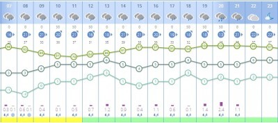 La predicción de la Agencia Estatal de Meteorología (Aemet) da lluvia para casi toda la jornada, como puede apreciarse en la imagen adjunta de la previsión hora a hora en Salamanca. Incluso se esperaba, algo que sólo se produjo durante la madrugada en las comarcas de Guijuelo, Béjar y Sierra de Francia.