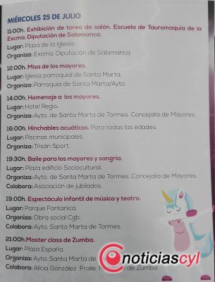 Continúan las fiestas patronales de Santa Marta de Tormes, que tienen lugar hasta el 30 de julio. Este miércoles protagonismo para los mayores con su comida homenaje y baile. También habrá exhibición de toreo de salón, hinchables acuáticos, música y teatro infantil, zumba y la color party.