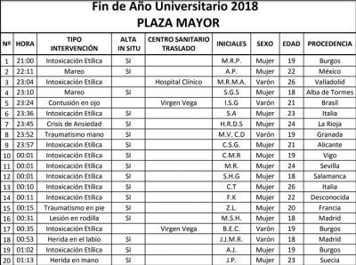 De igual manera, el servicio de Urgencias ha hecho público el informe de intervenciones durante la celebración del Año Nuevo Universitario que tuvo lugar este jueves. En total, 21 atenciones, 12 mujeres y 9 hombres, con edades comprendidas entre los 17 y los 27 años. 6 de los pacientes, con residencia en Salamanca y el resto proceden de las provincias de Madrid, Valladolid, Brugos, León y Pamplona.