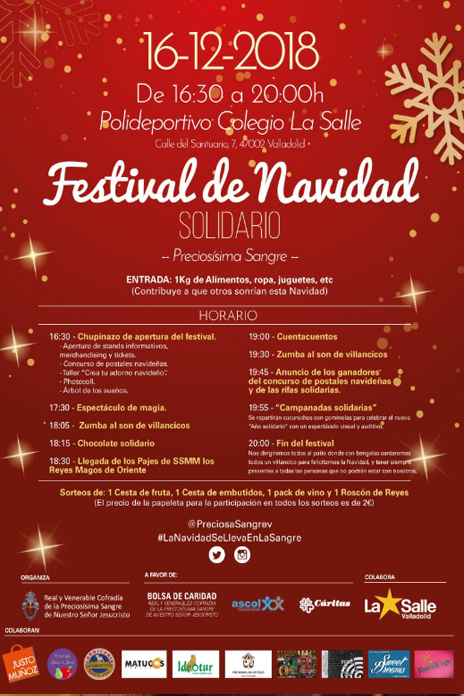 La Real y Venerable Cofradía de la Preciosísima Sangre de Nuestro Señor Jesucristo organiza por primera vez un Festival de Navidad Solidario. Será este domingo 16 de diciembre de 16:30h a 20:00h en el polideportivo del Colegio de La Salle (Calle Santuario, 7).