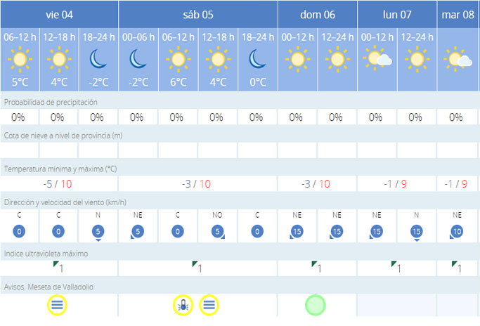 Para este sábado, en la capital del Pisuerga, no se esperan precipitaciones y las temperaturas oscilarán entre los -3 grados de mínima y los 10 de máxima. A las 18:30 horas, momento del comienzo de la Cabalgata, se espera que los termómetros marquen los 4 grados temperatura que irá bajando progresivamente.