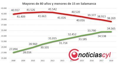 La diferencia entre ambas generaciones se acrecienta cada año que transcurre y al mismo tiempo se reduce otra diferencia más significativa sobre lo que es la pirámide de población de Salamanca. Los mayores de 80 años, lo que ya se denomina cuarta edad, son 34.565, medio centenar más, muy cerca de los niños menores de quince años, 38.269, setecientos menos, por lo que las posibilidades de relevo generacional son cada vez menores.