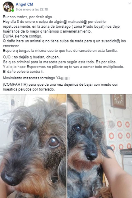 “Buenas tardes, por decir algo. Hoy, día 8 de enero por culpa de algún/a malnacido/a por decirlo respetuosamente, en la zona de Torrelago (Prado Boyal), nos dejó huérfanos de lo mejor que teníamos por envenenamiento. Duna, siempre contigo”, se apuntaba en el grupo de Facebook que lleva por nombre Amigos de Laguna de Duero.