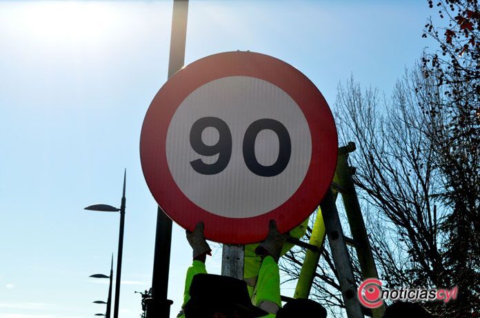 El subdelegado del Gobierno en Zamora, Ángel Blanco, junto con el jefe provincial de Tráfico, Eduardo Polo, y responsables del subsector de Tráfico de la Guardia Civil y de la unidad de carreteras, han asistido esta mañana al cambio de la última señal de la provincia que limita la circulación de 100 km/h a 90km/h en carreteras convencionales para turismos y motocicletas, mientras que para camiones y furgonetas el límite será de 80km/h.