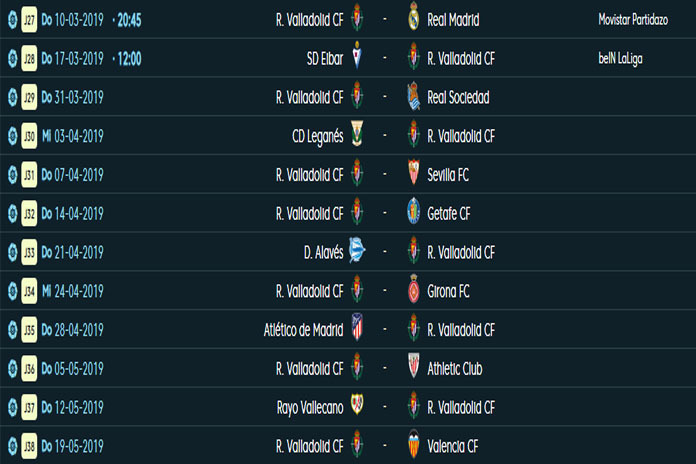 De los 12 encuentros que le restan al conjunto pucelano, 7 serán en casa, aunque a los de Sergio les esperan visitas complicadas como la que tendrá que afrontar a finales de abril, en el Wanda Metropolitano, ante el Atlético de Madrid o, en un duelo que se espera a vida o muerte, ante el Rayo Vallecano en feudo madrileño en la penúltima fecha.