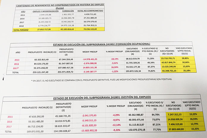 El Grupo socialista en el Parlamento regional ha asegurado además que en el Subprograma de Gestión de Empleo, entre los años 2015 y 2017, se quedaron sin ejecutar en total 37,8 millones de euros, un 22,25% del presupuesto fijado inicial y 65,2 millones en el Subprograma de Formación ocupacional, un 25,18% de lo presupuestado al comienzo.