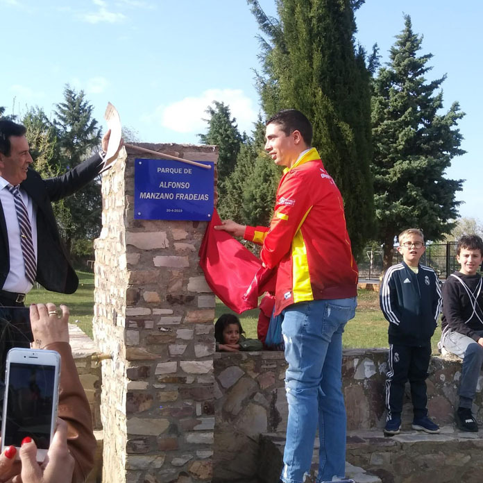 Una nueva denominación que descubrió el propio Alfonso Manzano acompañado de su madre, del alcalde, José Carlos Reguilón  y la concejala de Cultura, Mari Paz Matellán. Durante el descubrimiento de la placa que da nuevo nombre al lugar,  el regidor local afirmo que “todavía te recordamos jugando en el parque que desde hoy lleva tu nombre. De niño te veíamos correr con la bici por estas calles siempre alegre y cariñoso. Nos sorprendió tu participación en las Olimpiadas, y todo el pueblo se sintió orgulloso de tus grandes éxitos. Eres todo un campeón, estamos orgullosos de ti, enhorabuena Alfonso.” Por su parte, el homenajeado, visiblemente emocionado, afirmo que "es un orgullo y un honor dar nombre a un lugar donde he sido muy feliz durante mi infancia".