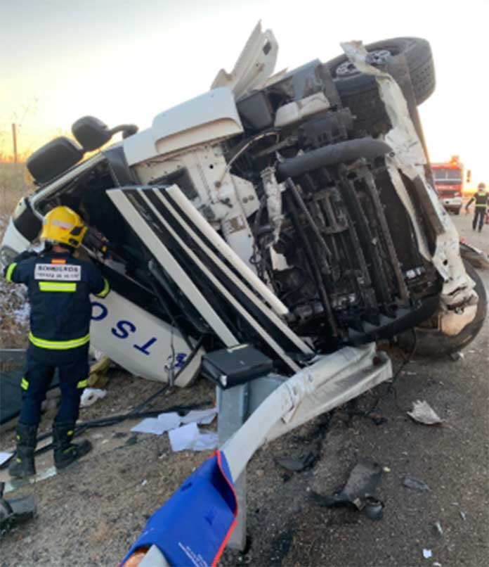Los efectivos del Parque de Bomberos de la Mancomunidad Tierras de Aliste, integrado en el Consorcio Provincial de Prevención y Extinción de Incendios de la Diputación de Zamora, han tenido que intervenir en un accidente producido en el kilómetro 494 de la N-122, entre Bermillo de Alba y Pino, por un camión de grandes dimensiones, el cual perdía el control, volcaba y chocaba contra el quitamiedos de la carretera ocupando toda la calzada.