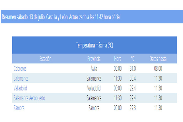 La temperatura máxima de la noche la ha marcado Cebreros en Ávila con 31º a las 00.00 horas mientras que Salamanca capital ha registrado, a las 11.30 de este sábado, una temperatura máxima de 30.4º.
