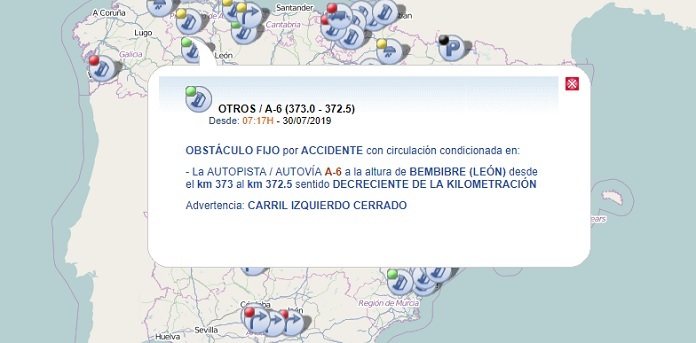 A primera hora de la mañana de este martes se ha producido un accidente de tráfico con el vuelco de un camión de reparto en la A-6, a la altura de Bembibre. Según informa la Dirección General de Tráfico (DGT) el carril izquierdo de la autovía permanece cortado por obstáculo fijo debido al suceso.