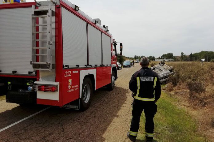 Los Bomberos del Ayuntamiento de León han intervenido esta tarde en un accidente de tráfico en la carretera LE-213 en la localidad leonesa de Villarmún. Un turismo se ha salido de la vía y una mujer se ha quedado con el brazo atrapado bajo el techo del vehículo. Además, una menor también se encontraba en el coche volcado.