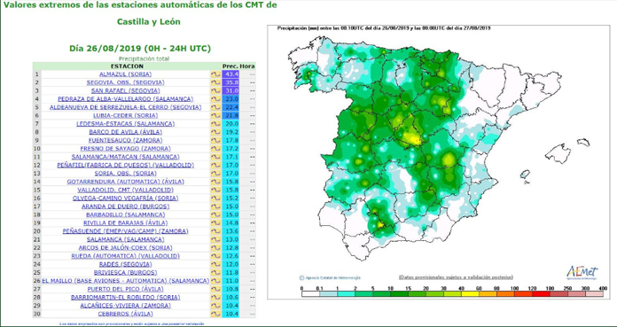 La Agencia Estatal de Meteorología ha presentado en la mañana de este lunes el ranking de los municipios de nuestra Comunidad en los que más llovió entre las 00 horas del lunes y las 00 horas del martes, con Almazul, en Soria, encabezando la clasificación, como vemos a continuación: