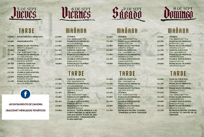 El Mercado Medieval se centra este años en el Cerco de Zamora, y la mayor parte de los espectáculos estarán orientados a esta época. Como espectáculos clave, un gran desfile el viernes a las 21:00 horas con los grupos de teatro y los cabezudos, conformando una comitiva de alrededor de 120 personas, y la cena medieval que tendrá lugar posteriormente, sobre las 21:45 horas, en la taberna.