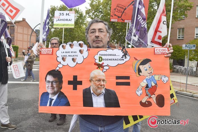 Cuestión de segundos, de minutos, o de horas, como es el caso, los anteriormente citados sindicatos se han concentrado hoy a las puertas de la Consejería de presidencia de la Junta de Castilla y León para exigir el cumplimiento del acuerdo de la Jornada Laboral de 35 horas al grito de “creo que Mañueco es Pinocho” y “creo que Igea es opaco”, en una manifestación que, según las fuentes convocantes, ha reunido a 1.500 personas.