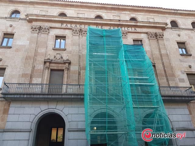 Las obras para la retirada del escudo franquista de la Audiencia Provincial de Salamanca, uno de los vestigios que aún restaban en la capital charra, continúan a buen ritmo desde que se iniciaran a finales del pasado septiembre.