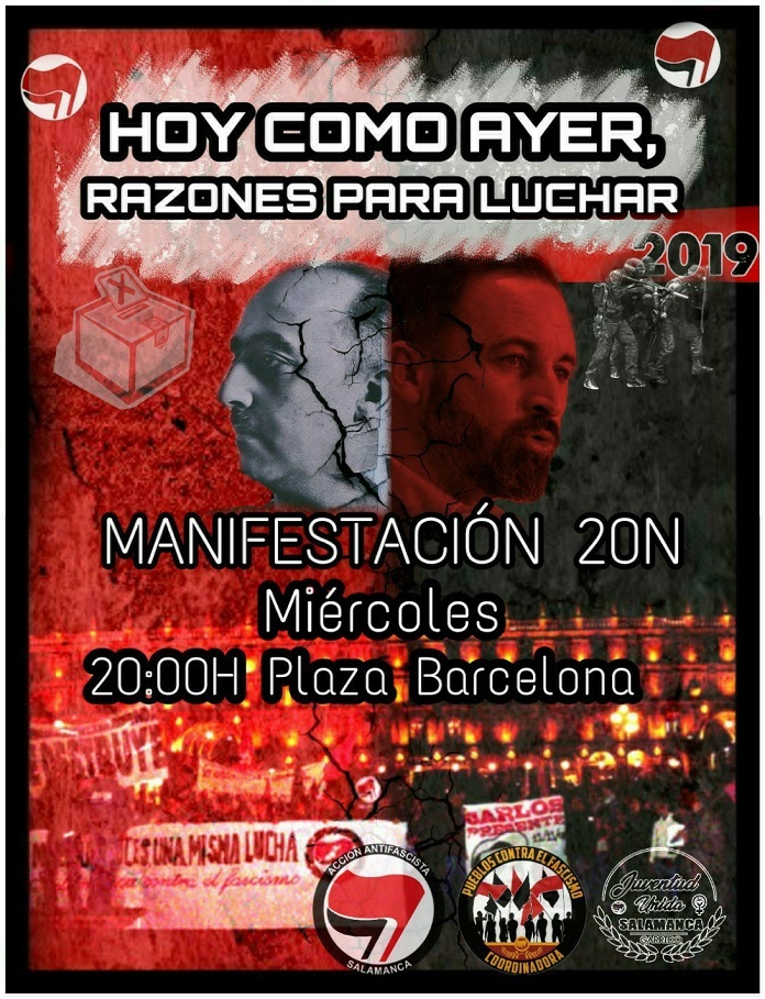 Esta tendrá lugar a las 20 horas en la plaza de Barcelona y está convocada, en concreto, por Acción Antifascista, Pueblos Contra el Fascismo y Juventud Unida Salamanca.