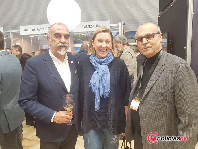 El vereador de Cultura y Turismo de Figueira de Castelo Rodrigo, Henrique Silva, el presidente de la Diputación de Zamora, Francisco José Requejo, y Carlos Velasco, en el stand de Zamora