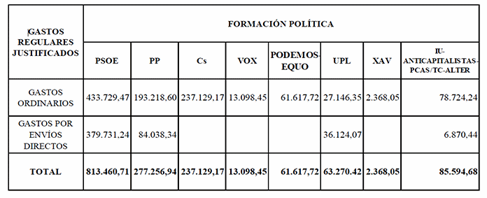 En consecuencia, el Consejo de Cuentas declara que los gastos regulares justificados por las formaciones políticas ascienden a 1.553.796,14 euros, 1.047.032,05 en concepto de gastos ordinarios y 506.764,09 en concepto de gastos por envíos directos de propaganda y publicidad electoral. Su desglose es el siguiente: