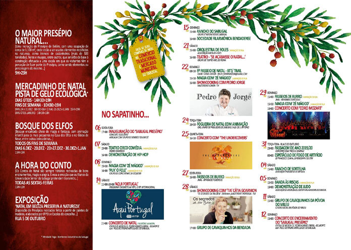 El día 24, martes, tendremos la tradicional hoguera de Navidad, organizada por la Unión de Freguesías de Sabugal y Aldeia de Sto. António, y el día 25 concierto con ‘The Undercovers’. Paseo con burro, plor la JMAL – Actividades Turísticas, en las tardes del día 27 y 29. El showcooking con ‘Tia Cátia’ (Chef Cátia Goarmon – ‘Os Segredos da Tia Cátia’ 24 Kitchen / MasterChef Portugal – TVI) discurre el día 28, al cual sigue la actuación del Grupo de Cavaquinhos da Bendada.