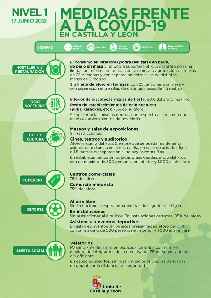 Castilla y León baja a Nivel 1 de alerta sanitaria, con relajación de medidas en comercio y hostelería y consumo en barra permitido