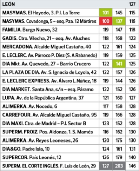 En resumen, la cadena de supermercados más barata de León es Masymas con sus dos locales en la capital leonesa ubicados en las calles El Hayedo 3 y Covadonga 5, con un cesta OCU que estaría cifrada en los 115 y 116 euros. A Masymas le sigue Familia, Gadis y Mercadona y E.Leclerc para completar el Top 5.