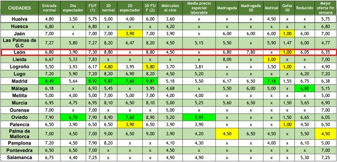 FACUA ha realizado un estudio comparativo de precios sobre los 132 cines en todas las capitales de provincia. En él se puede rescatar los datos de León para que todos los leoneses puedan tener la información antes de ir a disfrutar de una película.