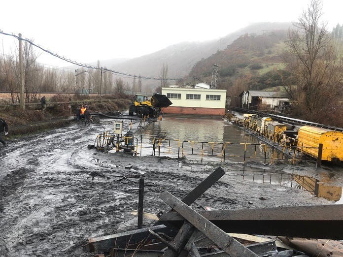 Tras determinar la solución técnica más acertada, el delegado y el alcalde de La Robla, Santiago Dorado, junto con los técnicos, se han acercado hasta las instalaciones de la empresa minera para ver in situ la situación acaecida en las últimas horas y comprobar cómo las máquinas han comenzado los trabajos.