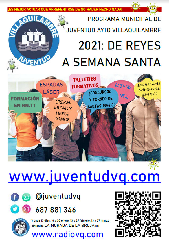 Port último, este año desde el departamento que dirige Eleuterio González Toribio se quiere poner el énfasis en el programa de radio juvenil “La Morada de la Bruja”, que colgará sus Podcast en redes sociales y en la web, www.radiovq.com cada 15 días, con entrevistas y noticias sobre los temas que más interesan a los adolescentes y jóvenes del municipio y de fuera de él. En definitiva, una completa programación, con un coste aproximado de 3.000 euros, en el que participan ocho entidades (Corocotta, Geodidrone, Escuela de Baile Mélanie y las asociaciones juveniles municipales Manadrain, Tsamsiyu, El rincón del Nephilim, La cuaderna del Norte y Tempus).