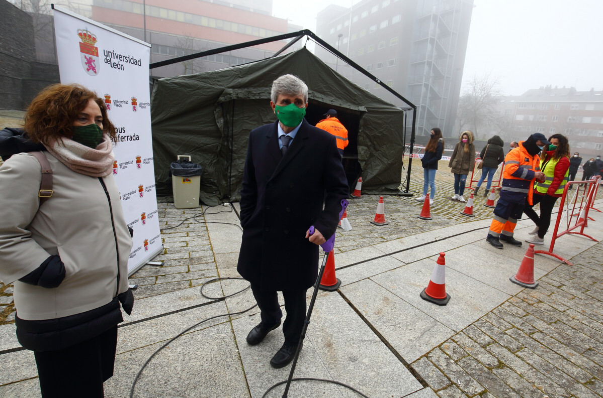 Varios centenares de alumnos y miembros de la comunidad educativa se sometieron hoy al cribado masivo con test de antígenos, organizado por la Gerencia de Asistencia Sanitaria del Bierzo en el Campus de Ponferrada de la Universidad de León (ULE). La gran afluencia a estas pruebas voluntarias de detección del COVID-19 provocó que se formaran largas colas en la explanada que se encuentra tras el edificio principal, donde se instaló la carpa en la que se practican las pruebas. “Esperemos que siga así todo el día”, explicó el rector de la ULE, Juan Francisco García Marín.